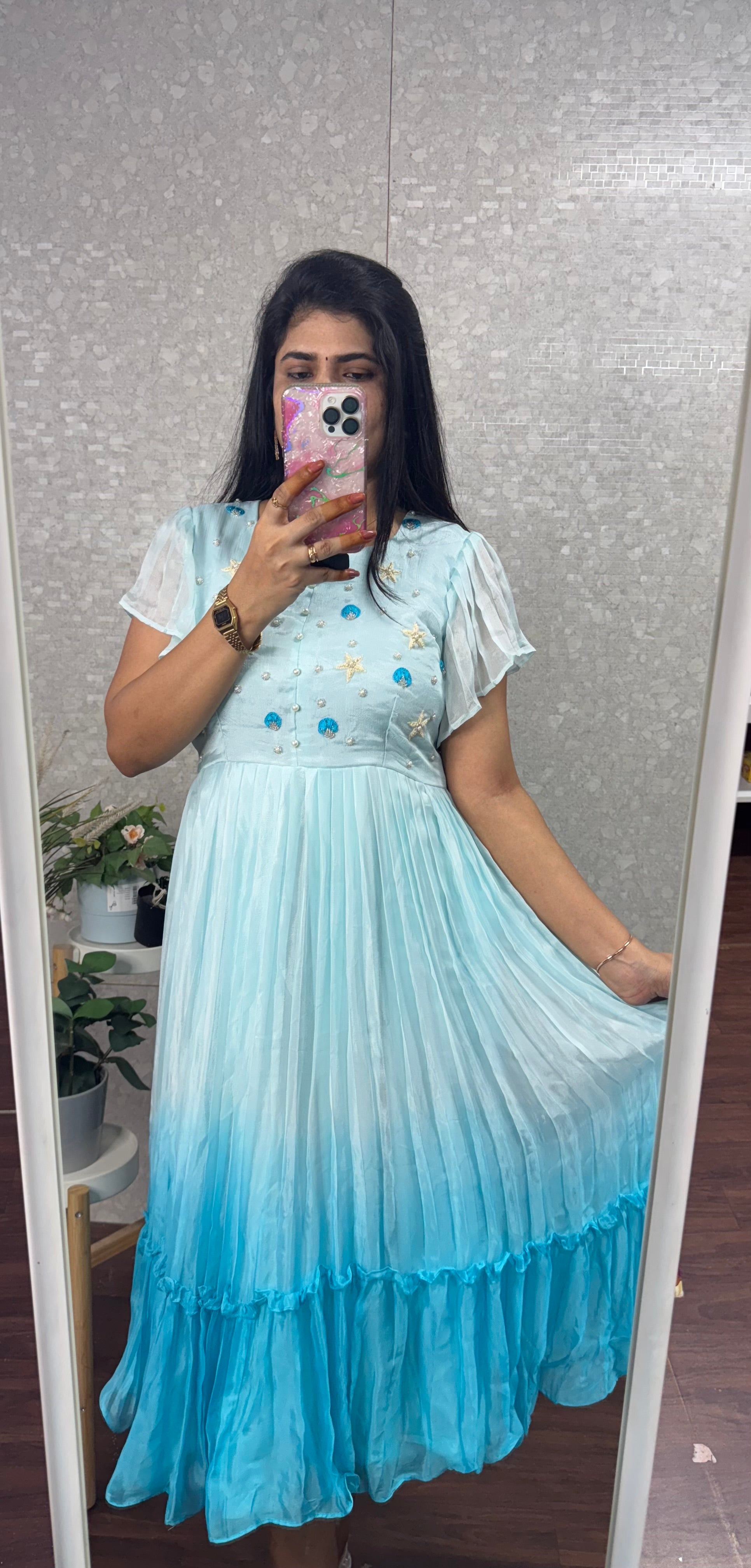 Pure Chinnon chiffon ombré frock with sea shore embroidery..model and sizes can b customised
