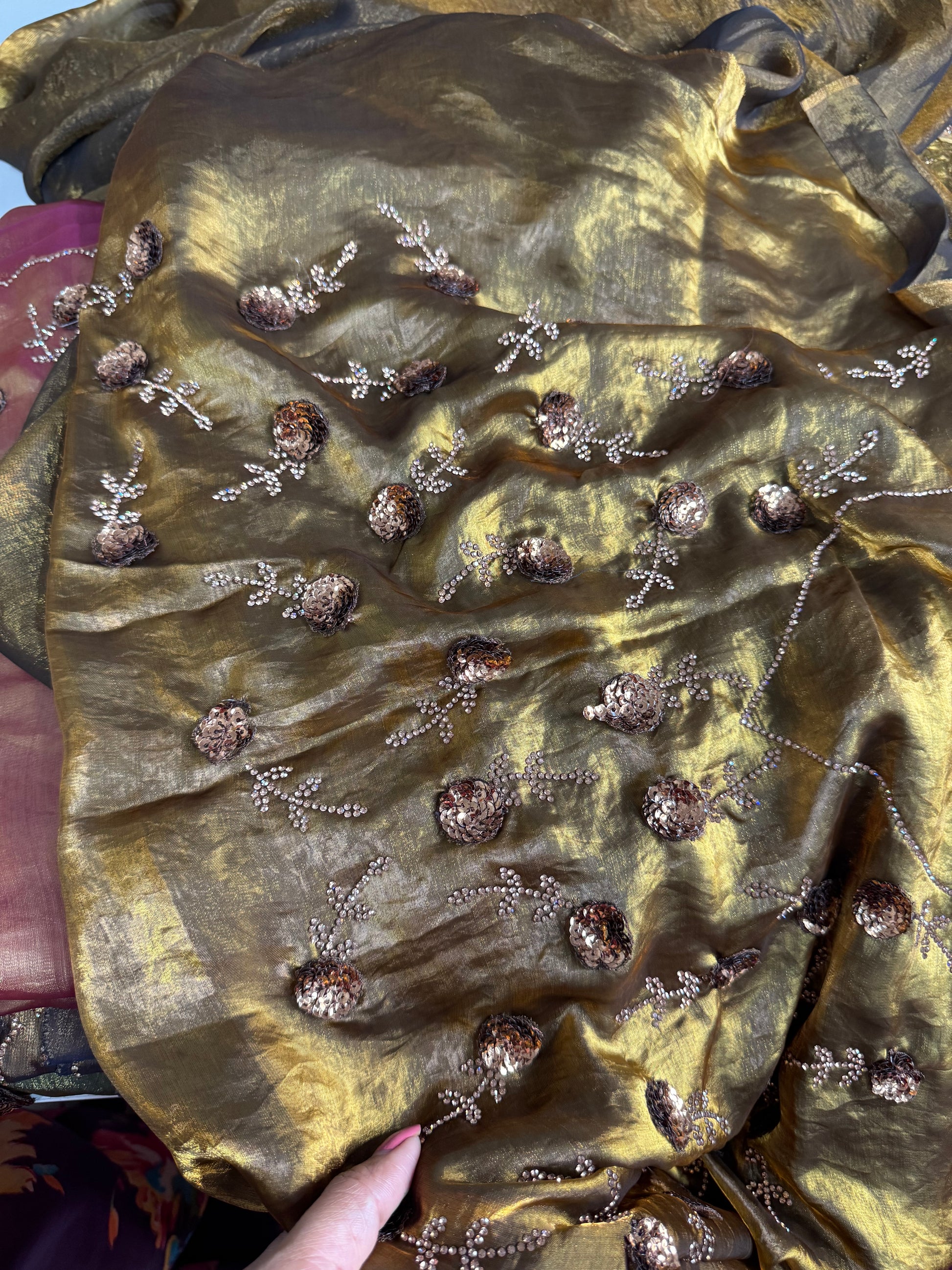 Pure space silk saree with heavy Swarovski and handwork borders paired with all overwork blouse