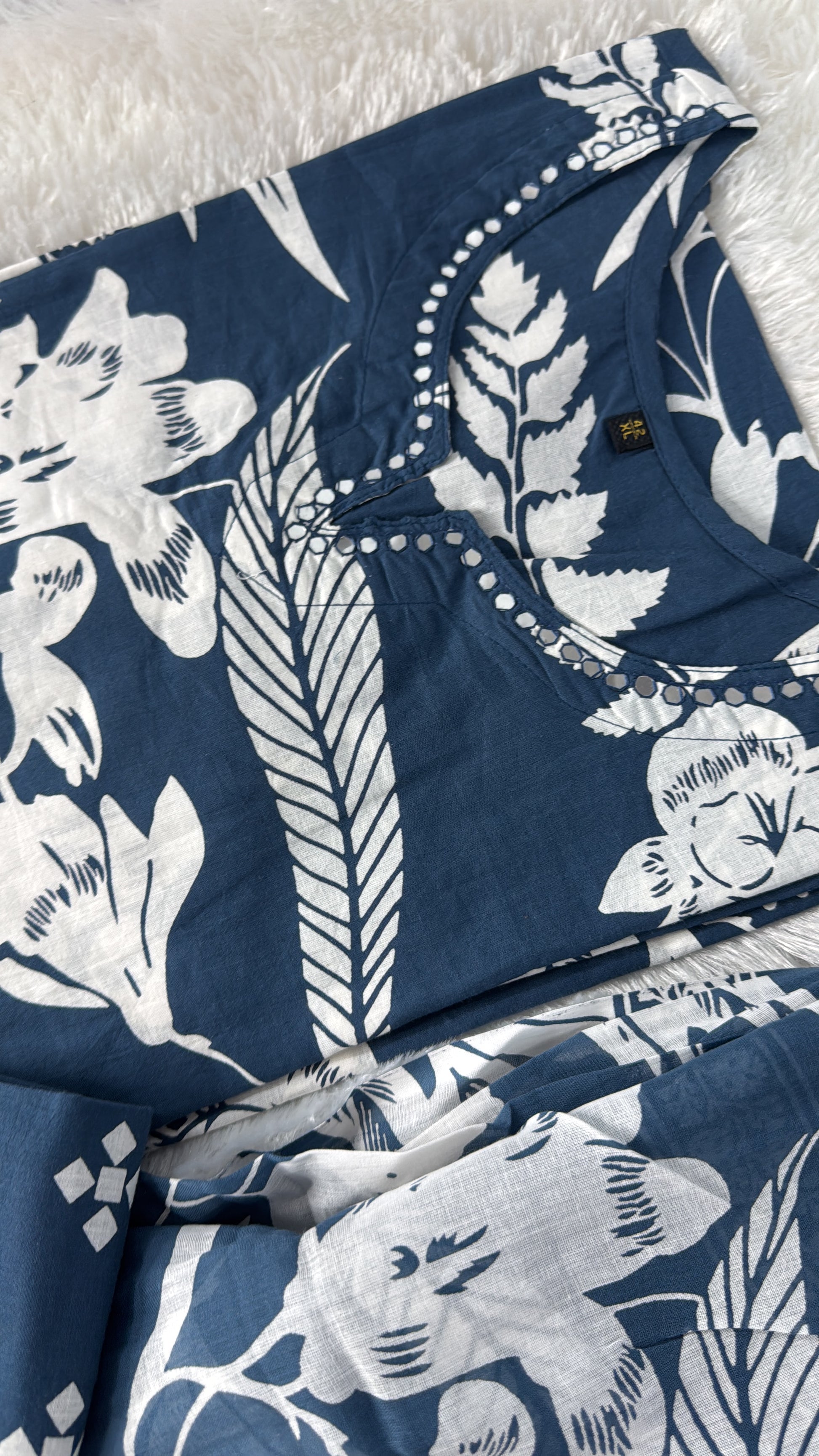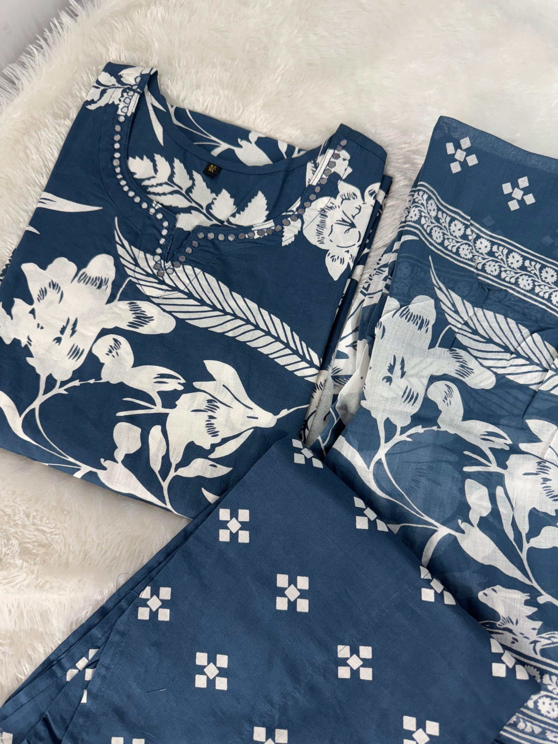 Printed cotton salwar set with mirror work on net paired with printed pants and dupatta