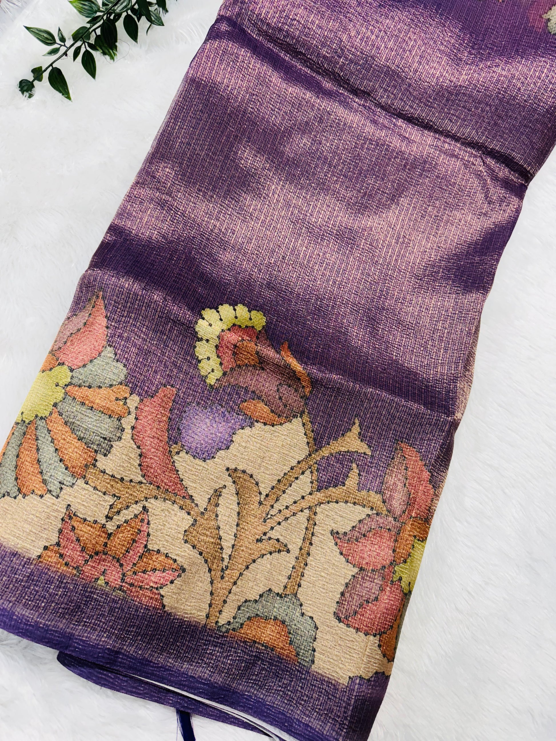 Crush tissue zari Kota saree with Kalamkari prints and pallu..paired with self colour printed blouse