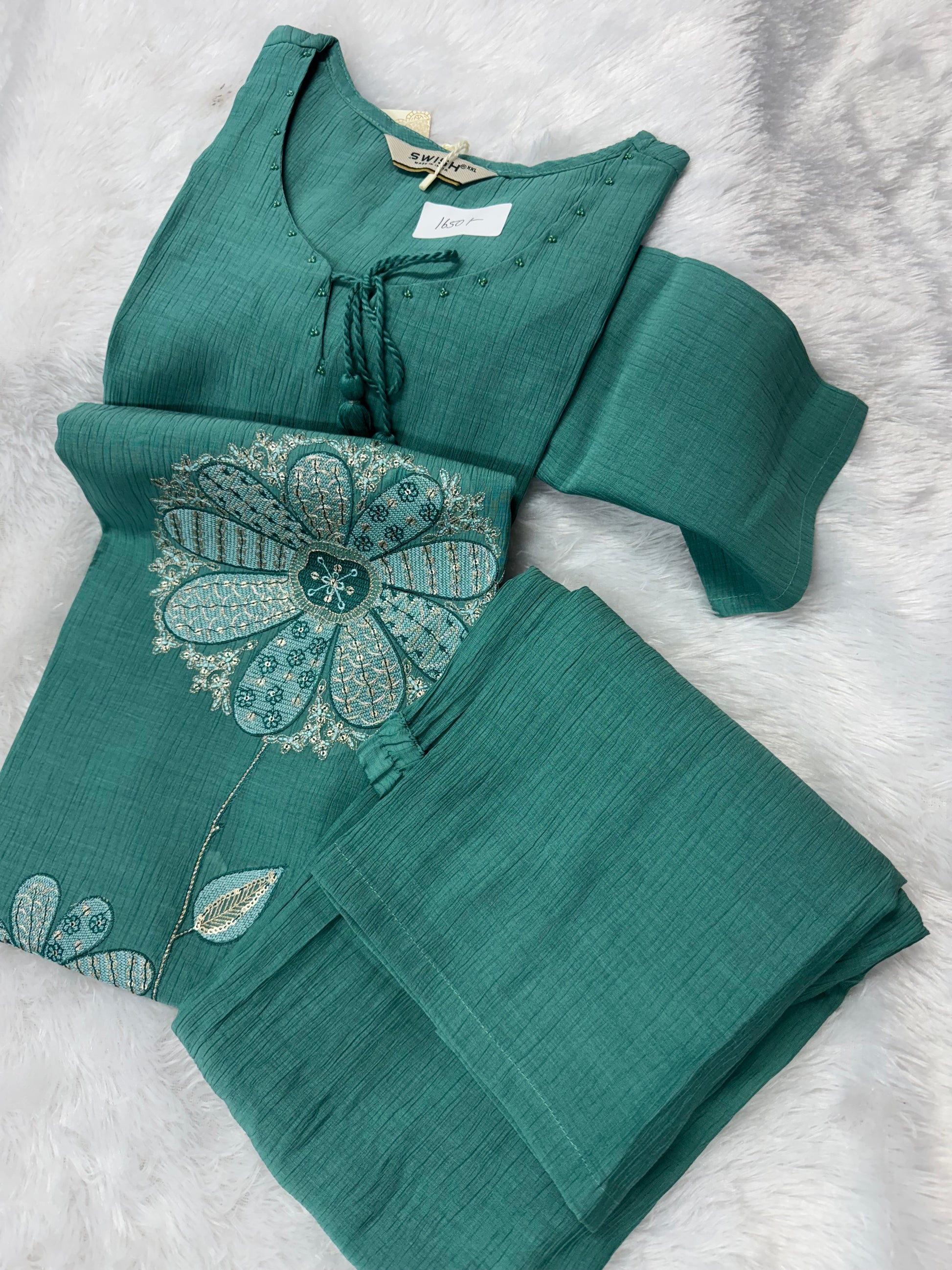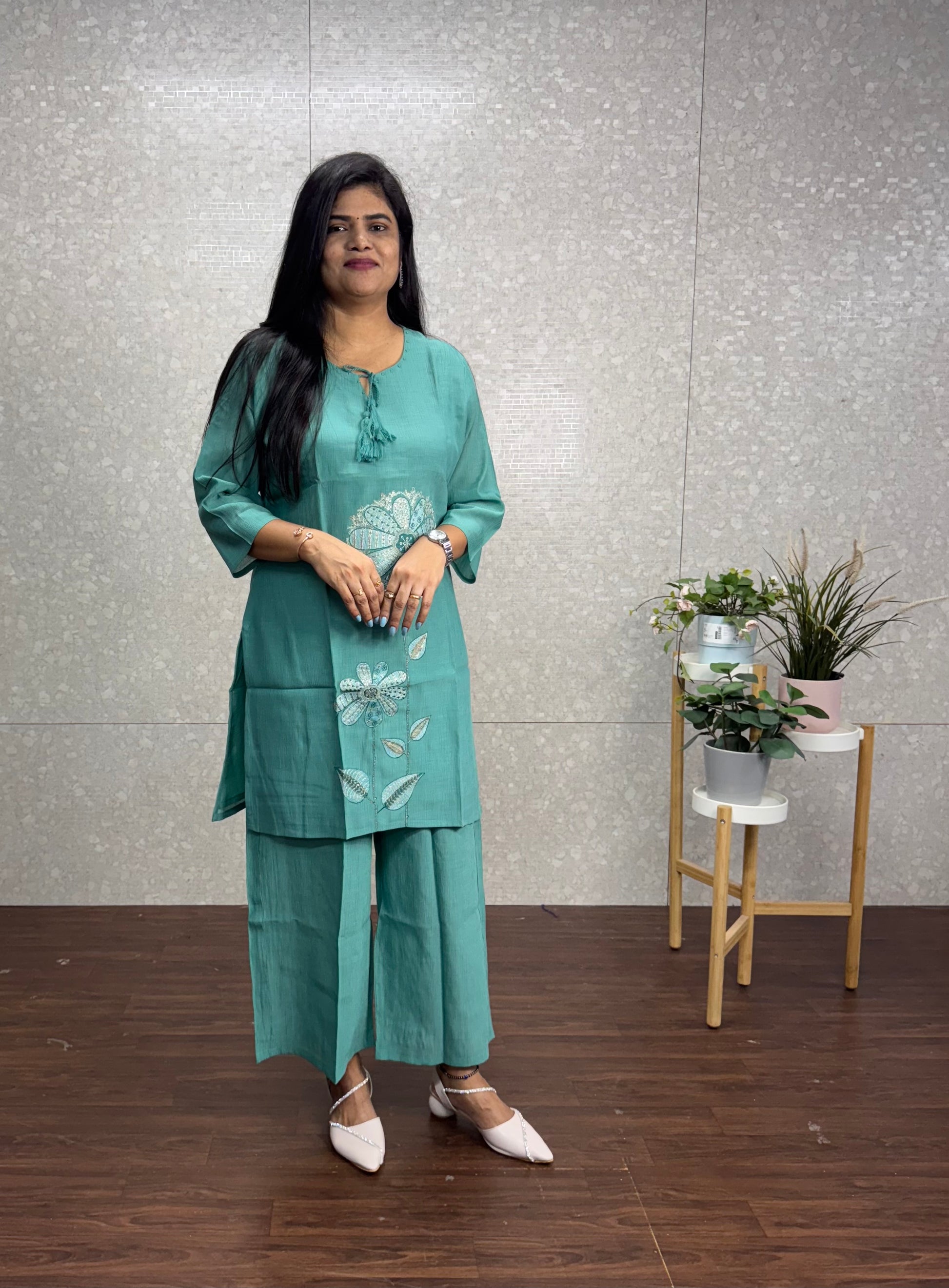 Imported crush silk cord set with embroidery top and flared pants