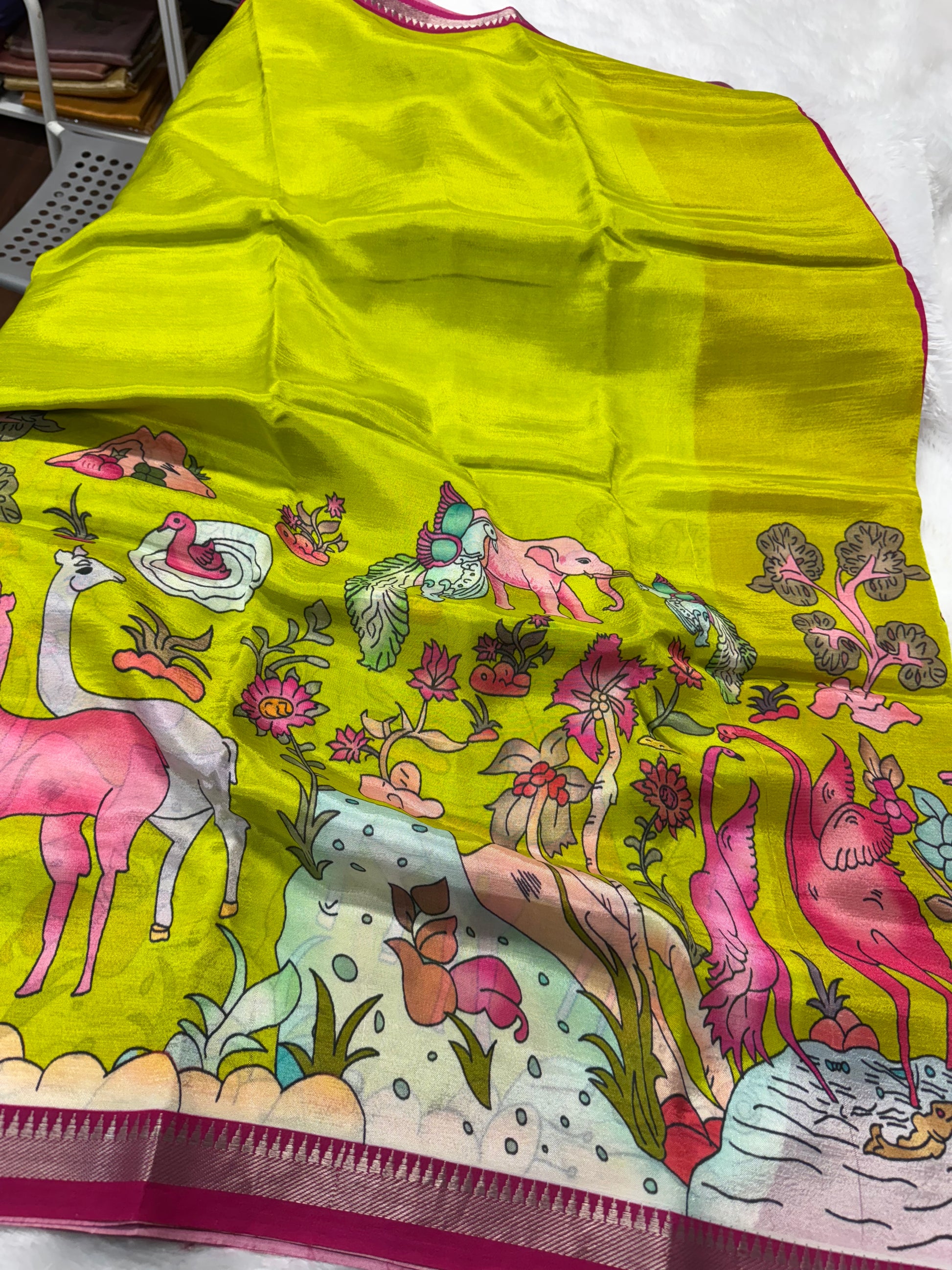 Pure handloom managalagiri pattu saree with Kalamkari prints contrast kalamkari pallu paired with contrast plain blouse