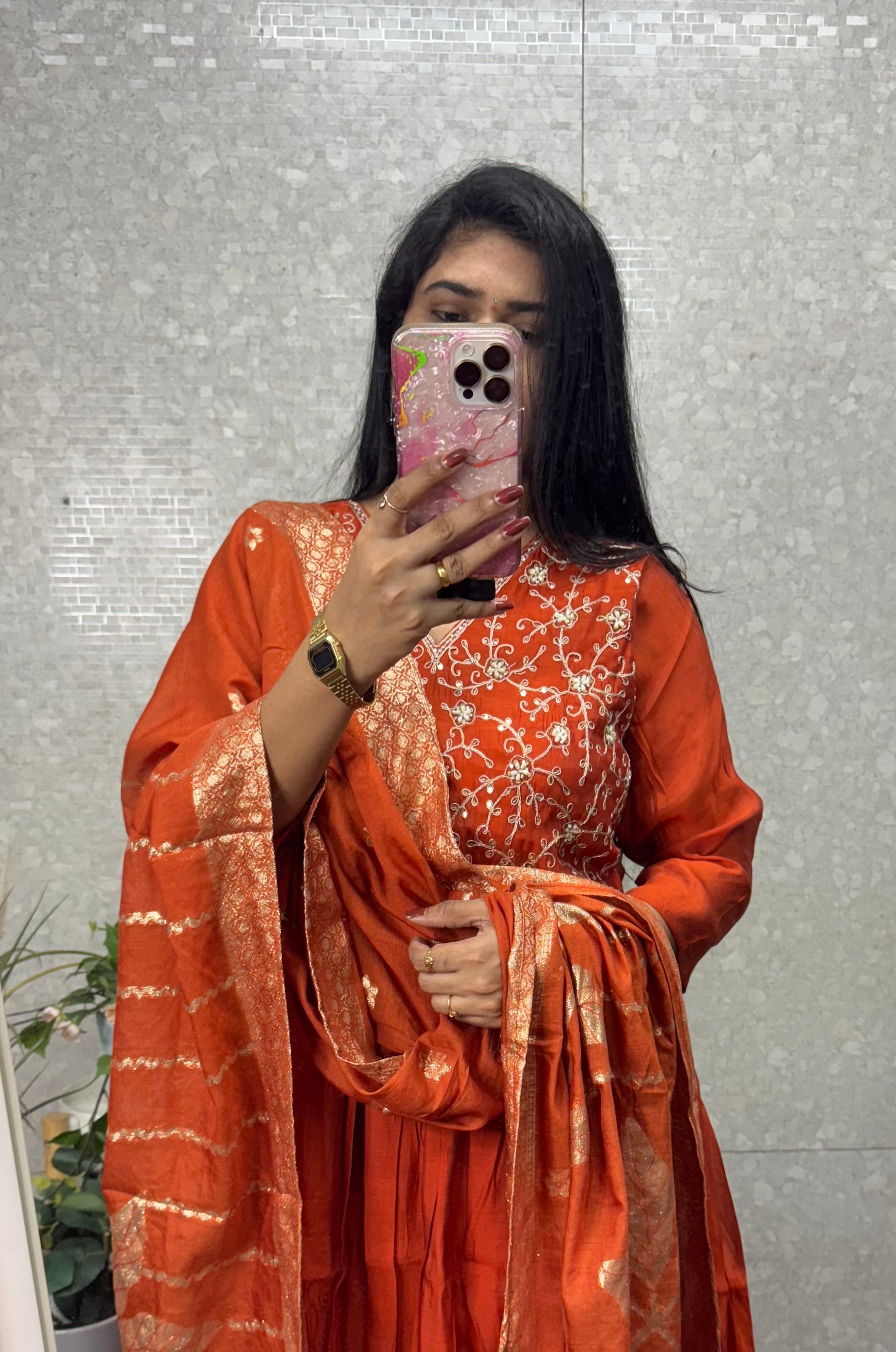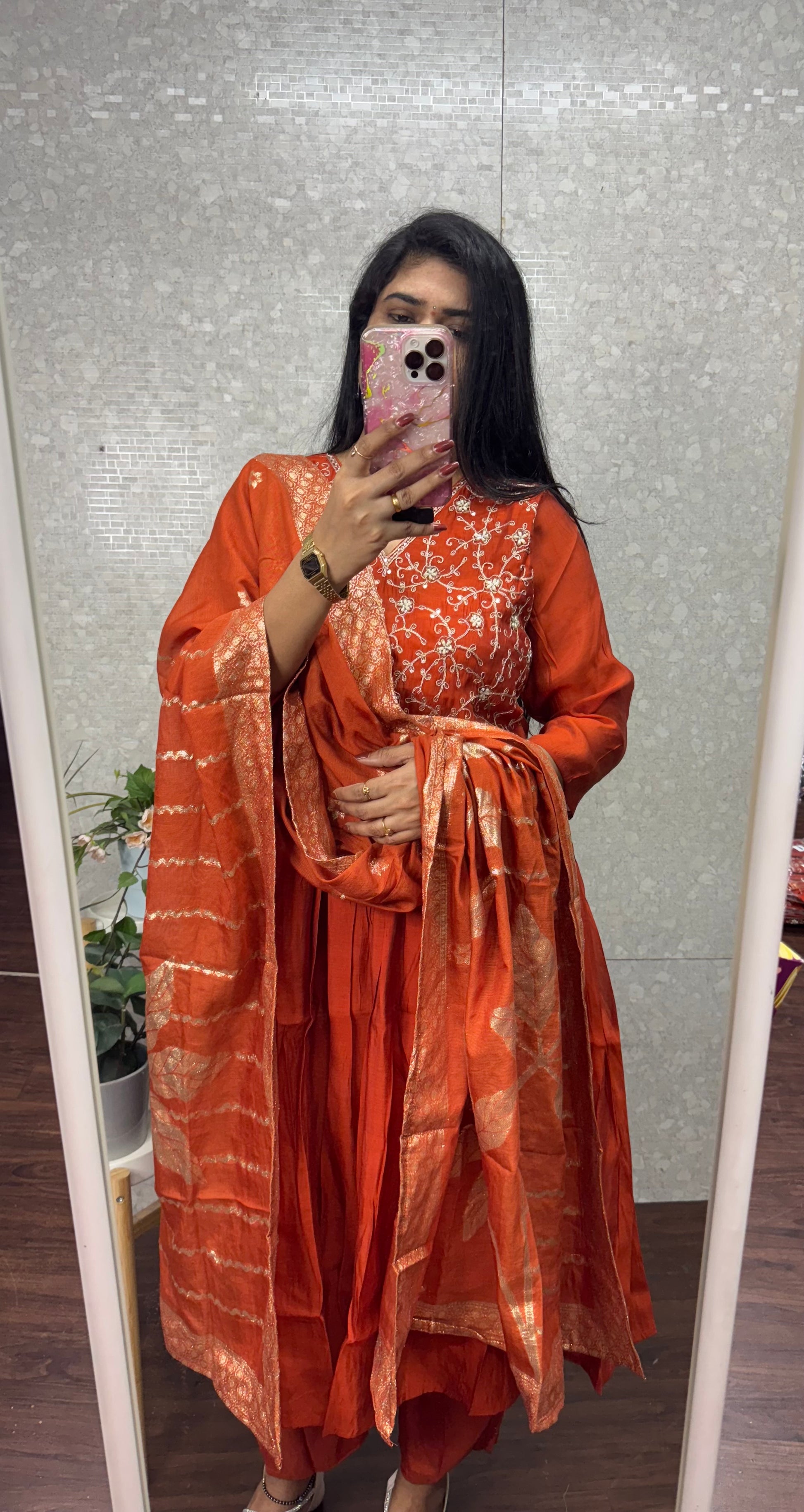 Pure mulchanderi A line suit with heavy embroidery paired with banaras dupatta and self colour pants