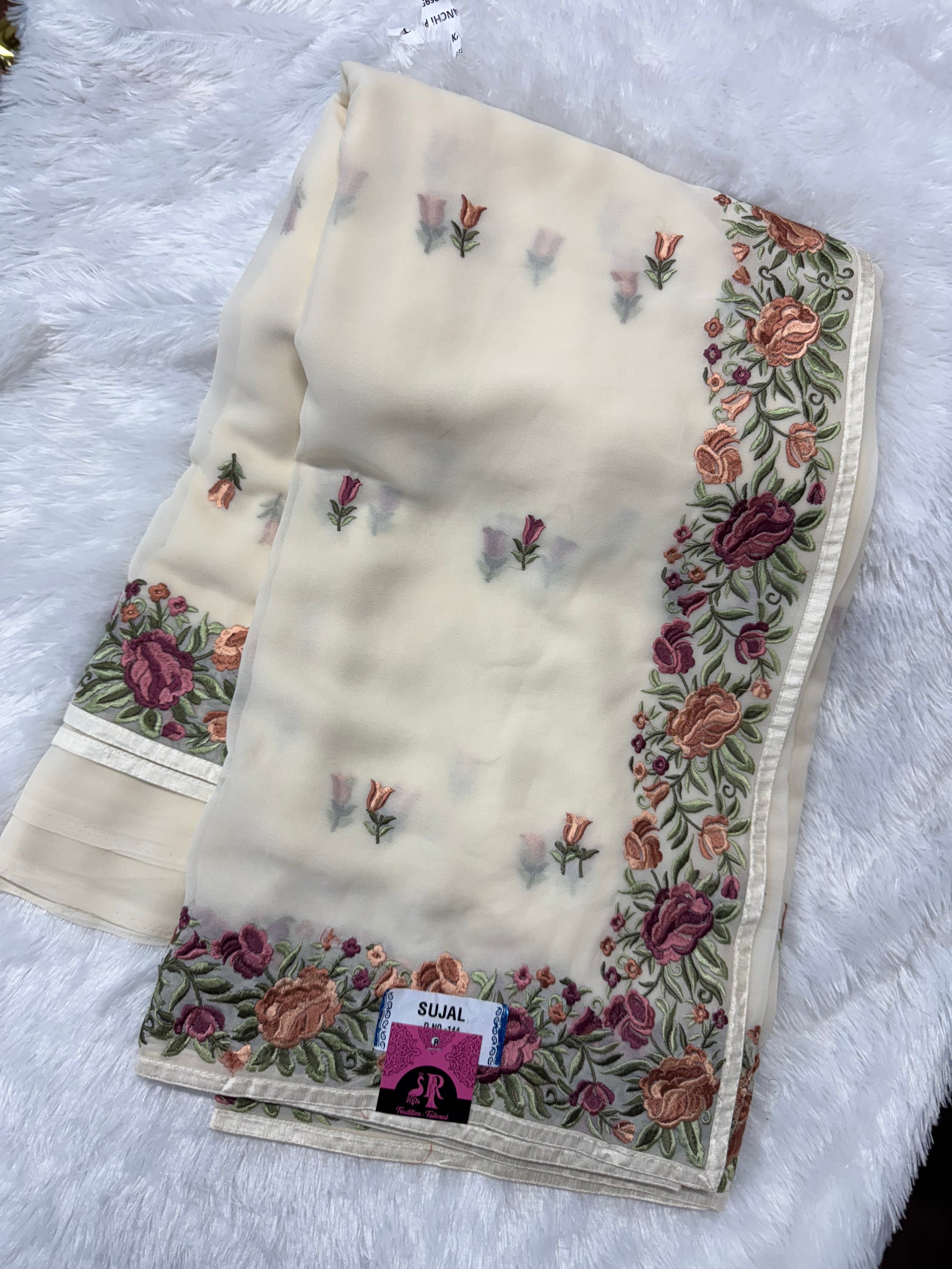 Parsi embroidery Georget saree paired with self colour blouse with embroidery butis