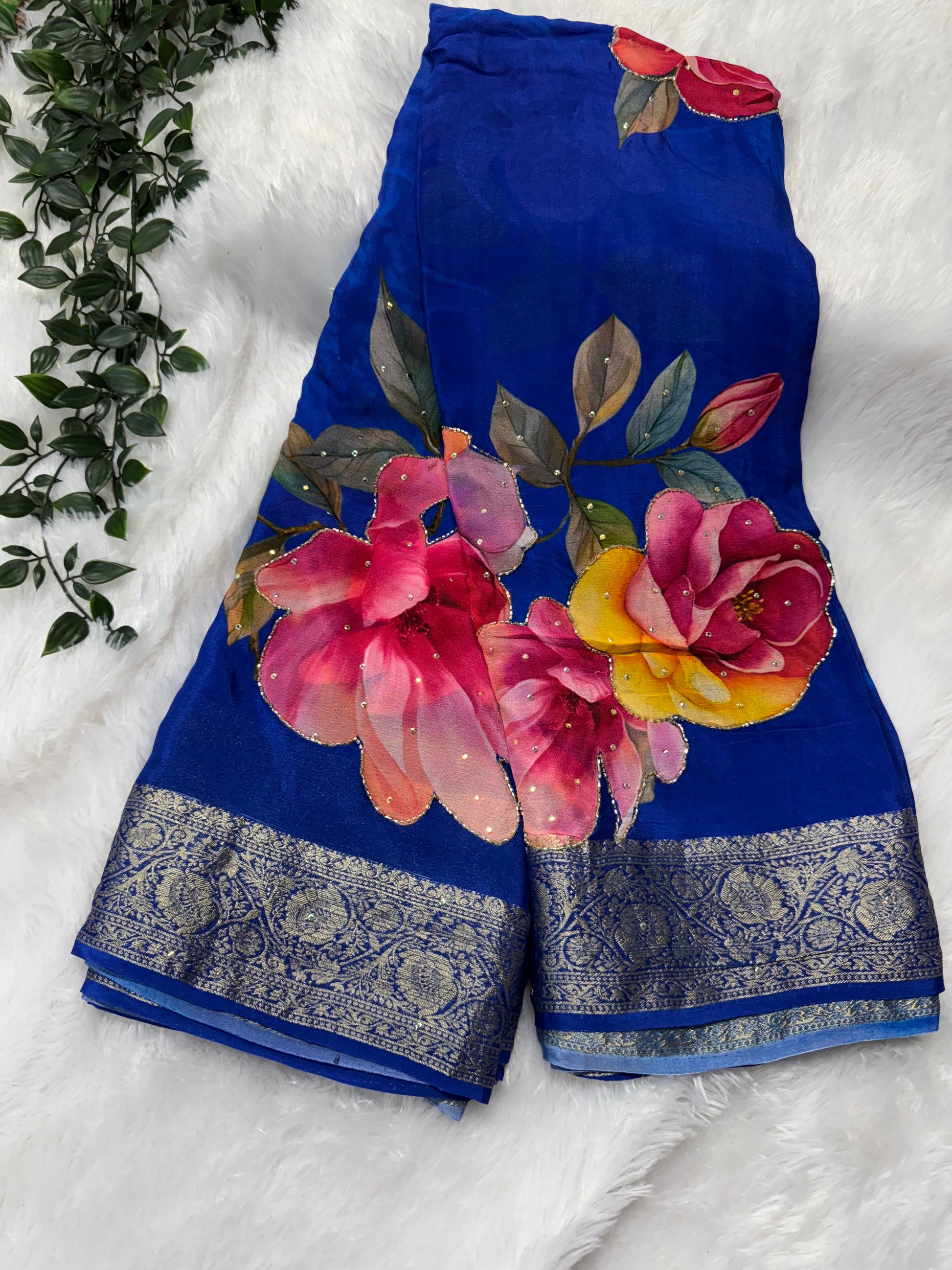 Pure Chinnon chiffon digital print saree with weaving zari borders and all d florals highlighted with Katdana embroidery paired with self colour plain blouse