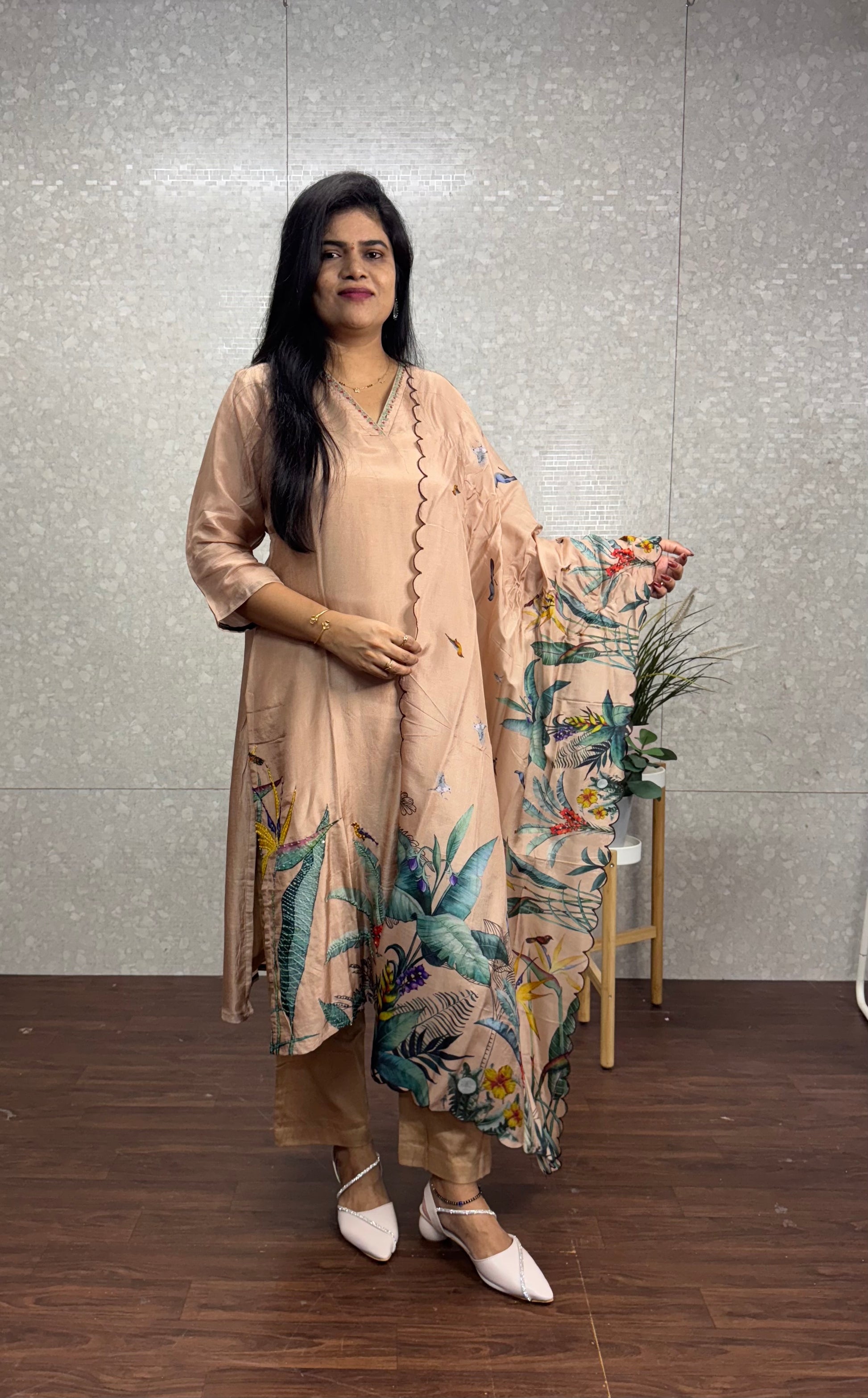 Pure dola silk designer suit with handwork highlights paired with digital print forest theme dupatta with scallop edges