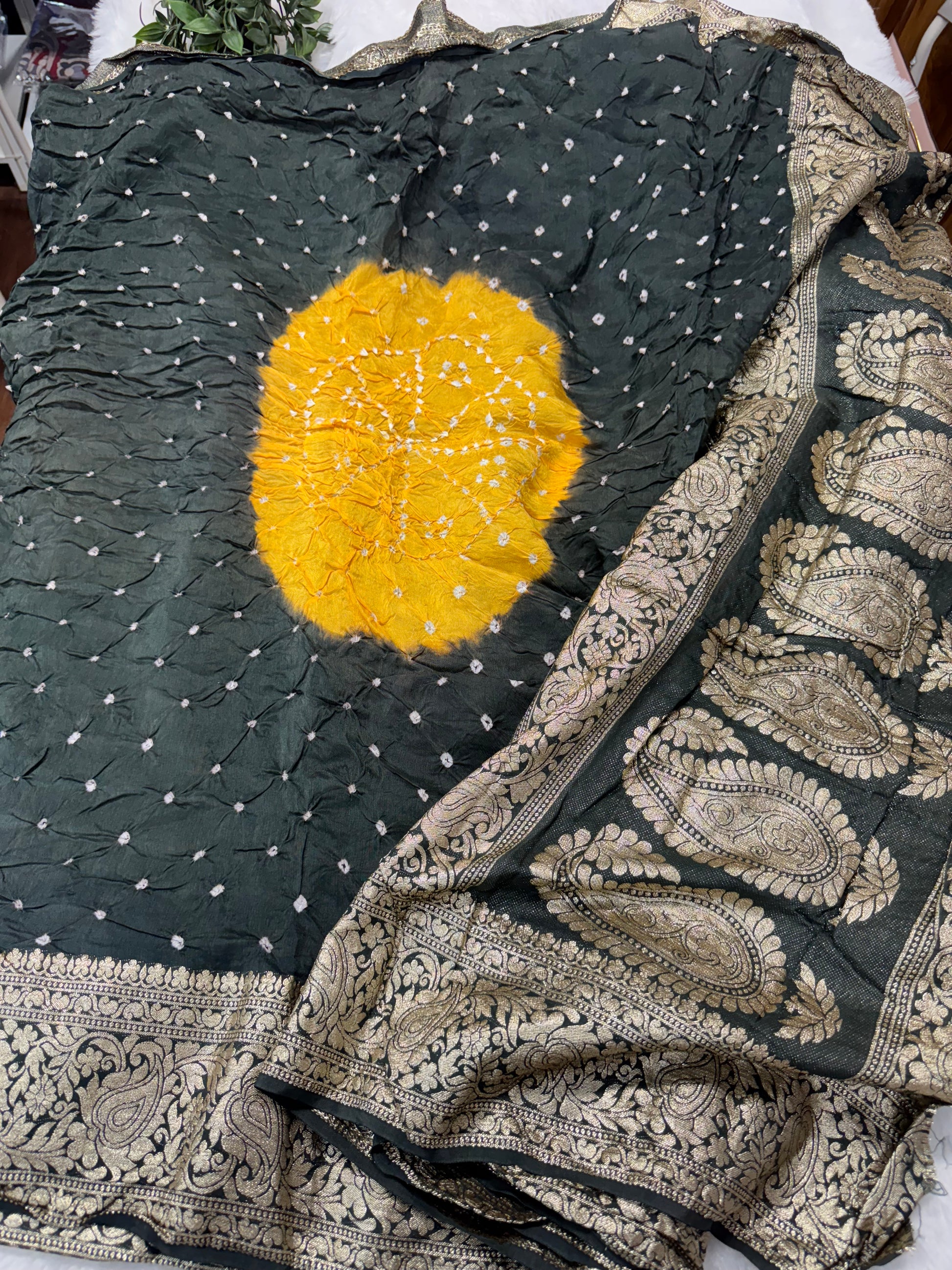 Pure Jaipur Bandhini silk sarees with jacquard weaving borders paired with contrast blouse